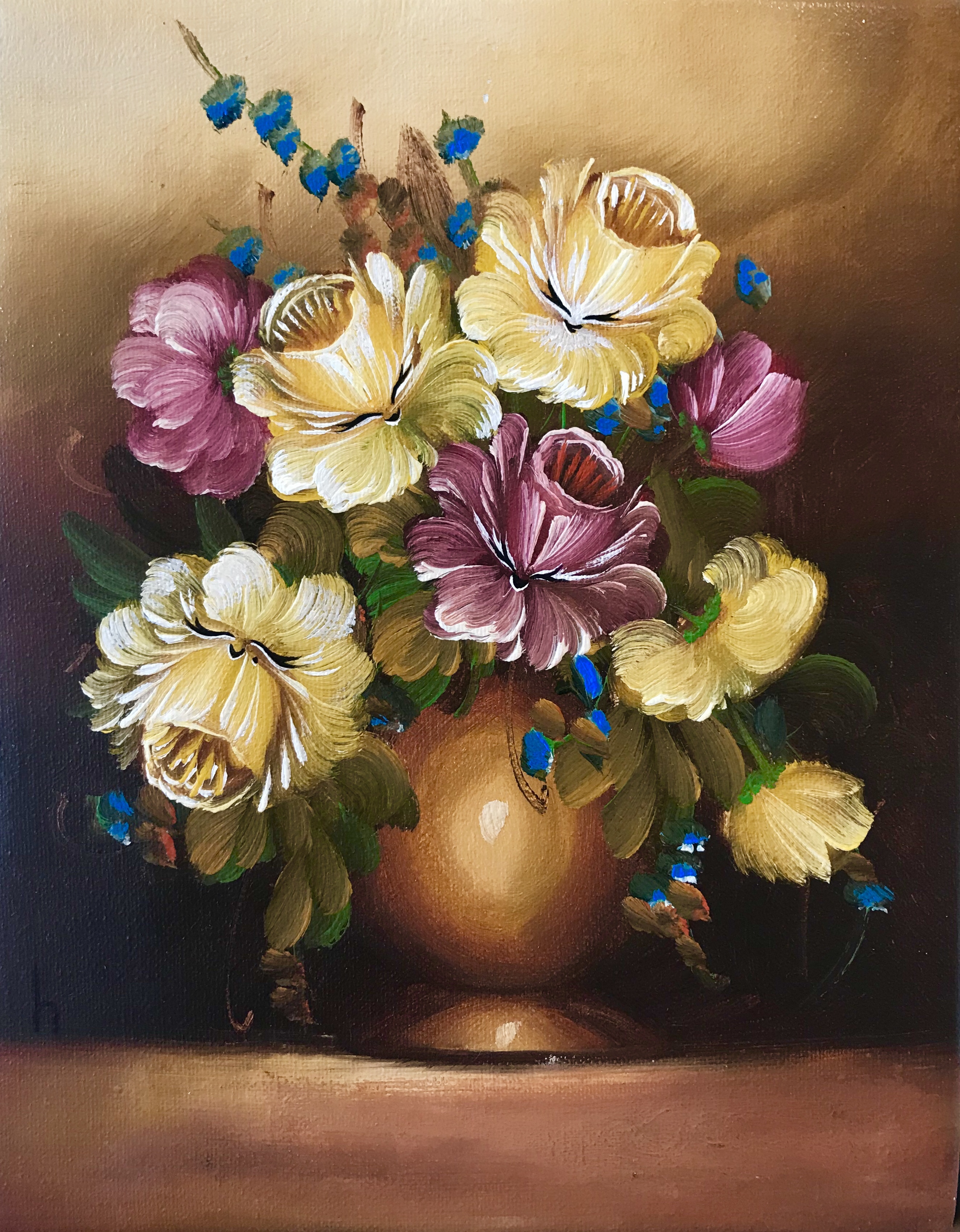 Part of my Upcycled Vintage Art collection, I found this little unsigned oil painting in a thrift shop. It reminded me of Disney’s Alice in Wonderland, and as a kid I loved the scene when the flowers were singing sweetly… then turning and nastily calling Alice a weed! Inspired, I added subtle little faces to the flowers, and brightened up the blues to freshen the colours up a bit.