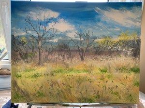 I have been wanting to try this for a while… a study of a landscape in early spring, before anything starts to grow after the winter thaw. Then each week or so, add to the painting whatever has grown in that scene… so in the end, its a painting of everything blooming at once. So, this is a work-in-progress, a painting of the little meadow behind our house in suburbia Brampton, Ontario! (I am working in acrylic on 40cm x 50cm canvas)