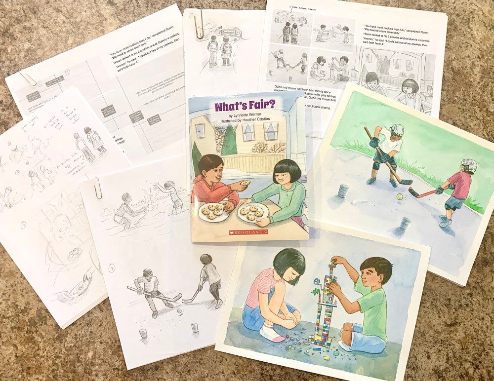 It was a nice surprise having the finished printed copy of What’s Fair? arrive in the post. I had the fun of illustrating this math book for Scholastic Education’s Math Place collection and am very pleased with how it has turned out. I especially enjoy illustrating kids in situations that are down-to-earth, like playing lego, working in messy classrooms and playing outside.