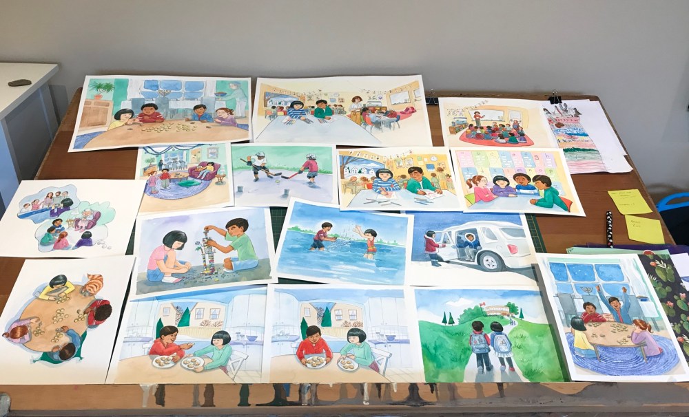 You can see in the photo above the steps in the process of illustrating this story. From the initial manuscript and doodles, to more worked out and revised sketches in the digital layout, to final artwork and printed book.