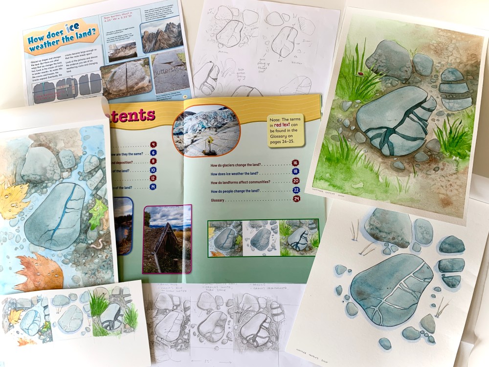 Illustrating the process of how ice can crack and split rocks was fun… it made me notice cracked rocks and cement everywhere I went! I do enjoy sneaking little amusing things in the illustrations for kids, like ladybugs and worms. These rock illustrations were used on two pages in the magazine.