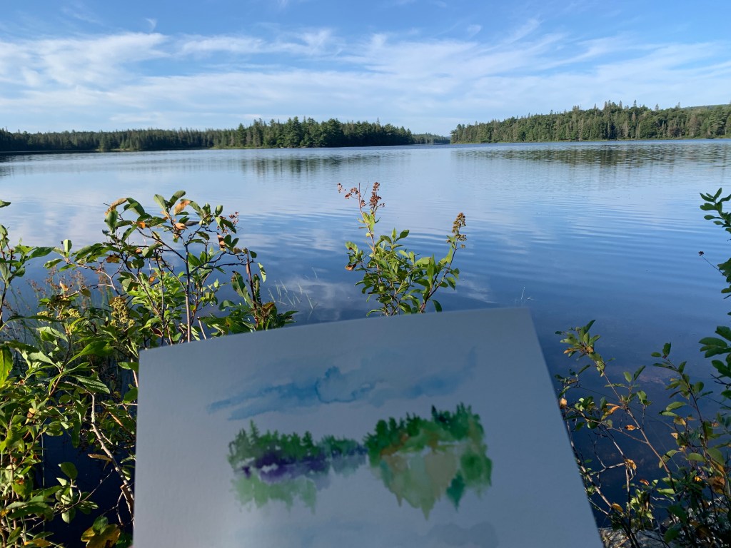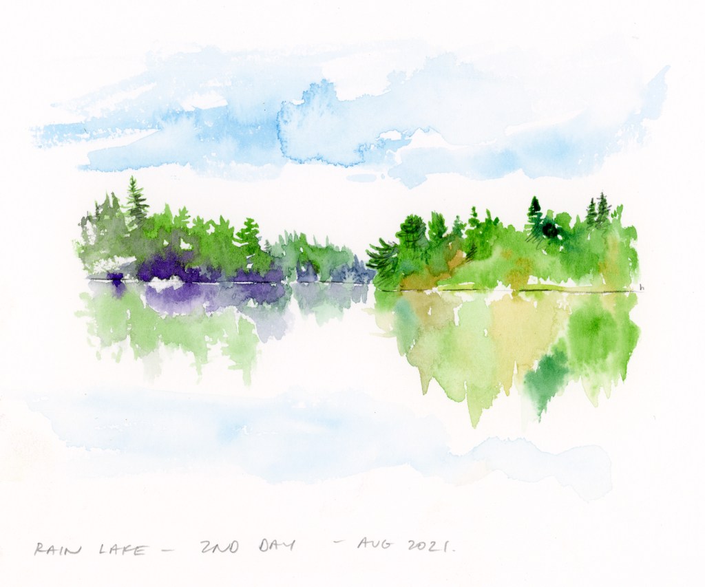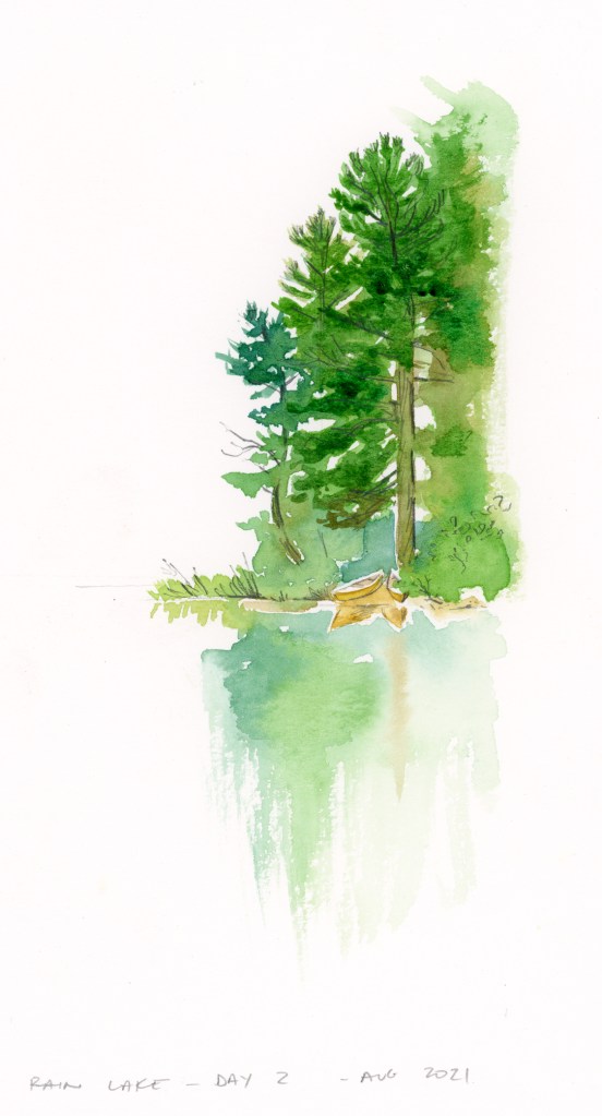Our second day in Algonquin Park on Rain Lake, was another smooth, glassy day on the water. I did a couple studies of the landscape, and finished up one I started the night before of the scrubby plants along the shore. (Yes those are red leaves, autumn is coming!)