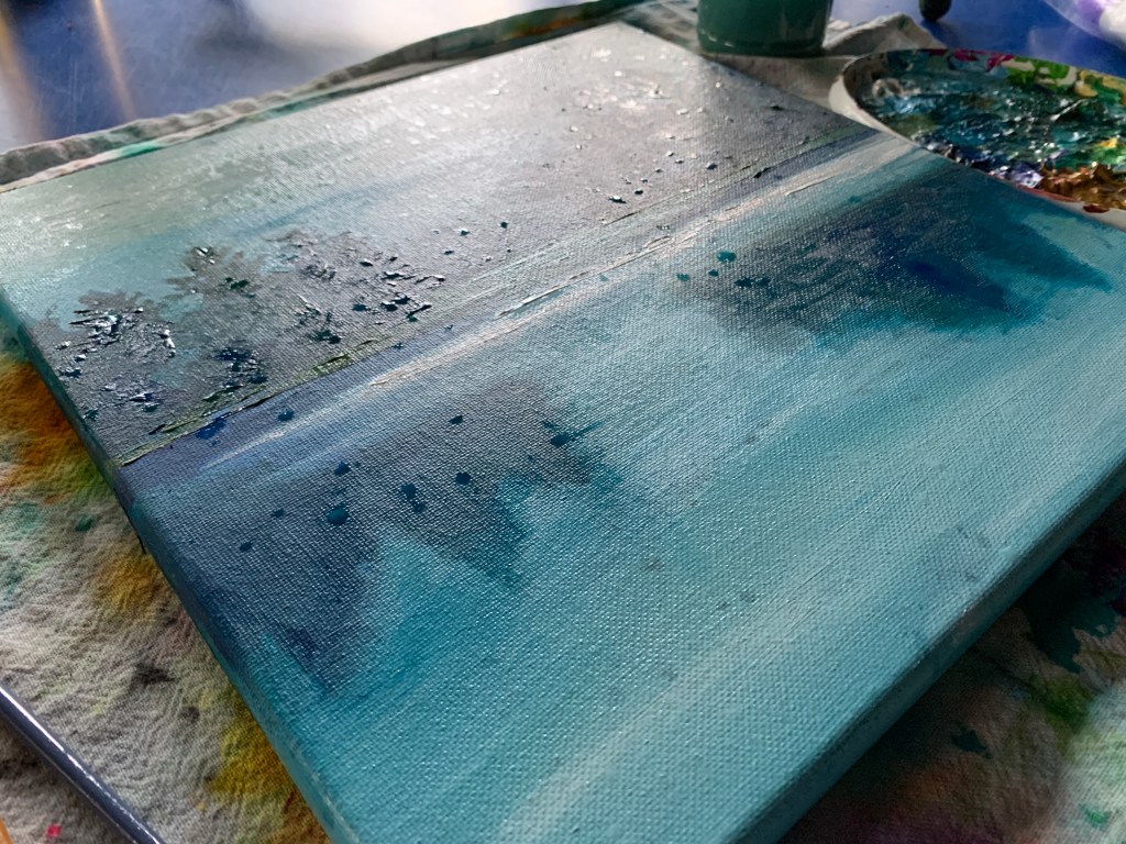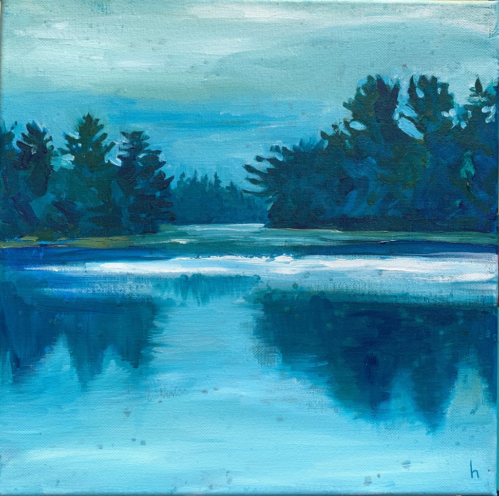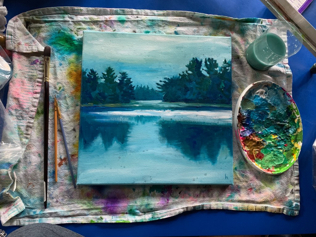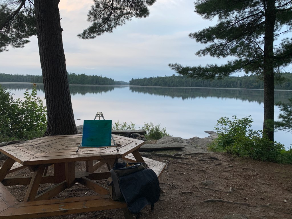On my easel the third day day in Algonquin Park on Rain Lake… did a quick 12×12 acrylic study of the view. Painted on a cool underpainting, working from dark to light. I was just about finished when the clouds opened up and started raining on me. There was nothing I could do about the raindrops, which lifted the partially dried acrylic off. But I kind of like it, the natural rain drops from Rain Lake captured on my painting.