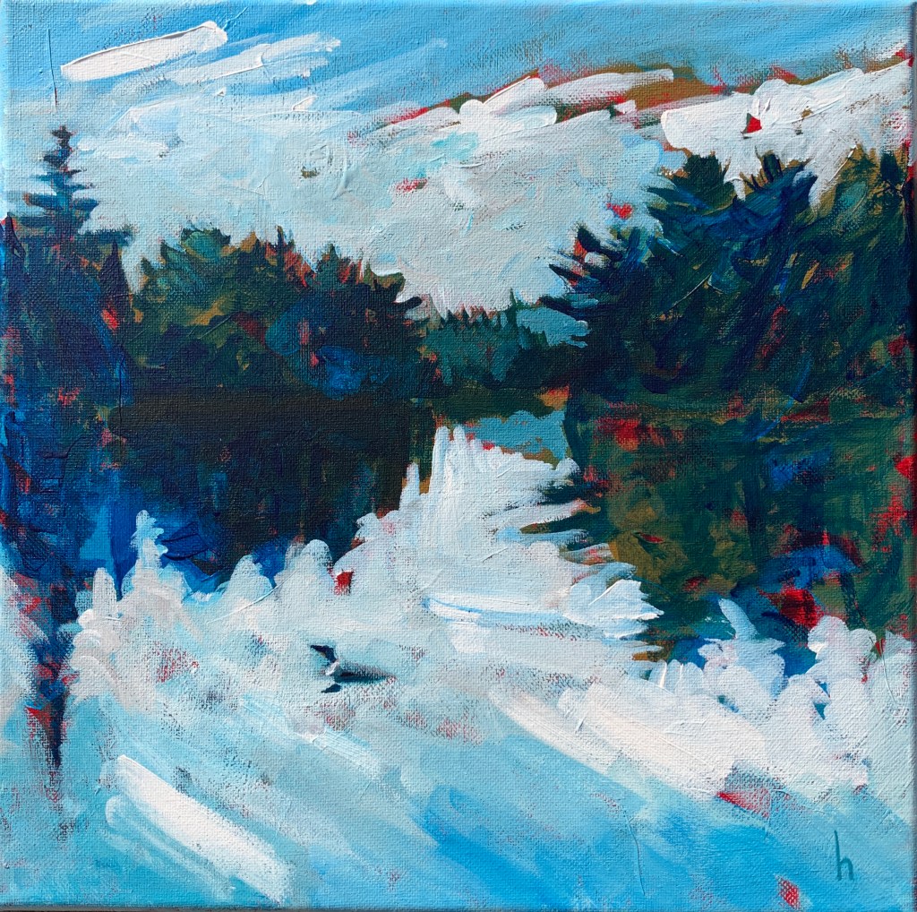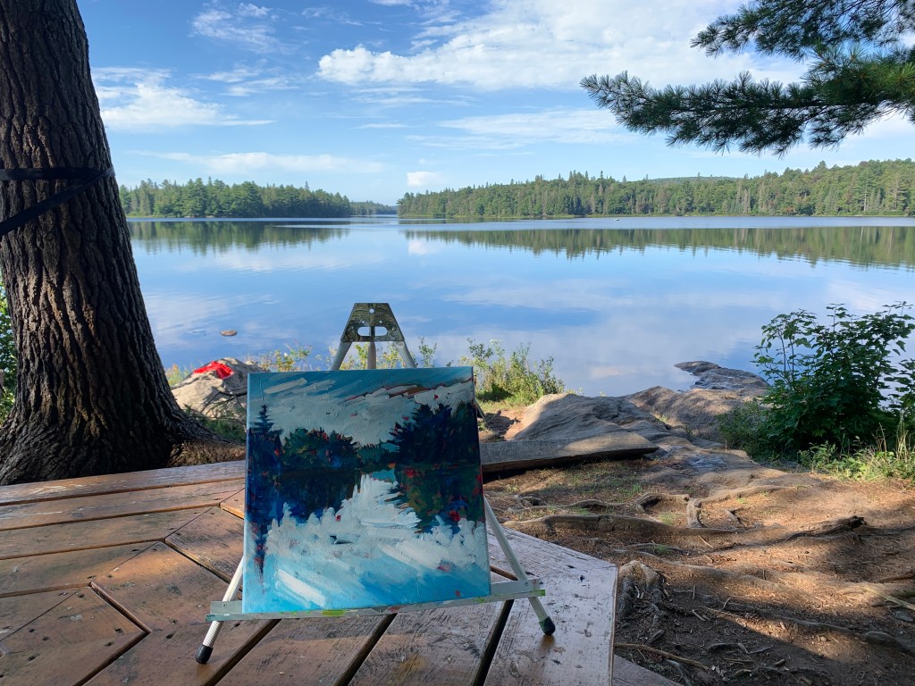 On my easel the fifth day day in Algonquin Park on Rain Lake… did another 12×12 acrylic study of the view. Painted on a canvas I had primed with a bright colour, then used up old bits of paint on to give it some more texture and colour before painting the landscape on top. You can see the flecks of unusual colours poking through. The loon really did pop up and sit there for me to quickly put down a few loose brush strokes. Painted outside except for me coming back and adding the loon’s reflection later.