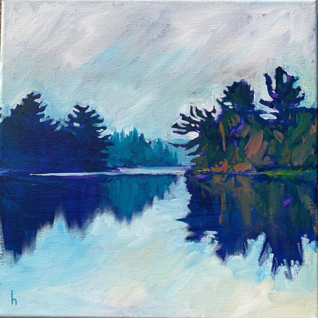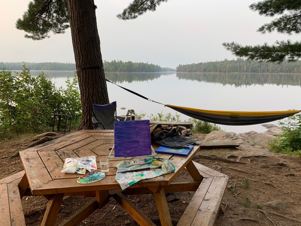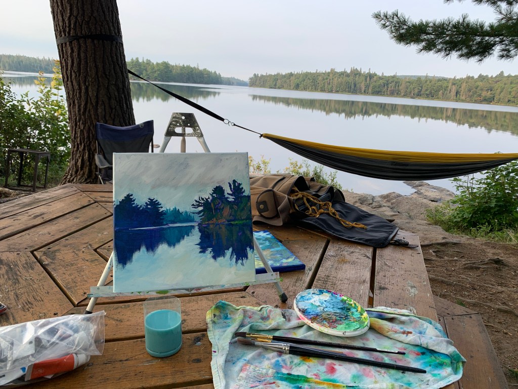 On my easel the sixth day day in Algonquin Park on Rain Lake… a last 12×12 acrylic study of the view. Painted on a canvas I had primed with purple, you can see the flecks of purple colours poking through.