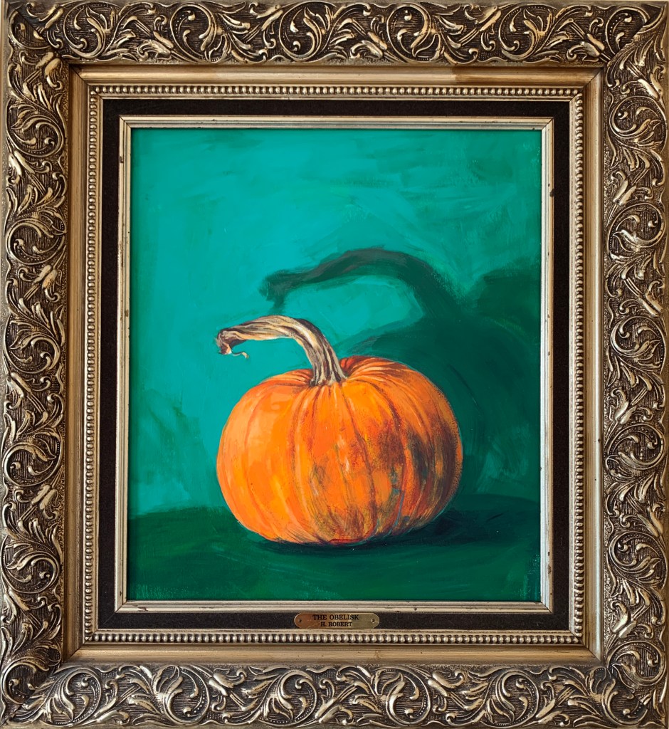 This pie pumpkin sat very still for me to paint its portrait. It was delicious. It’s the most “serious” pumpkin in my petite pumpkin patch of artwork. Now available on Etsy.