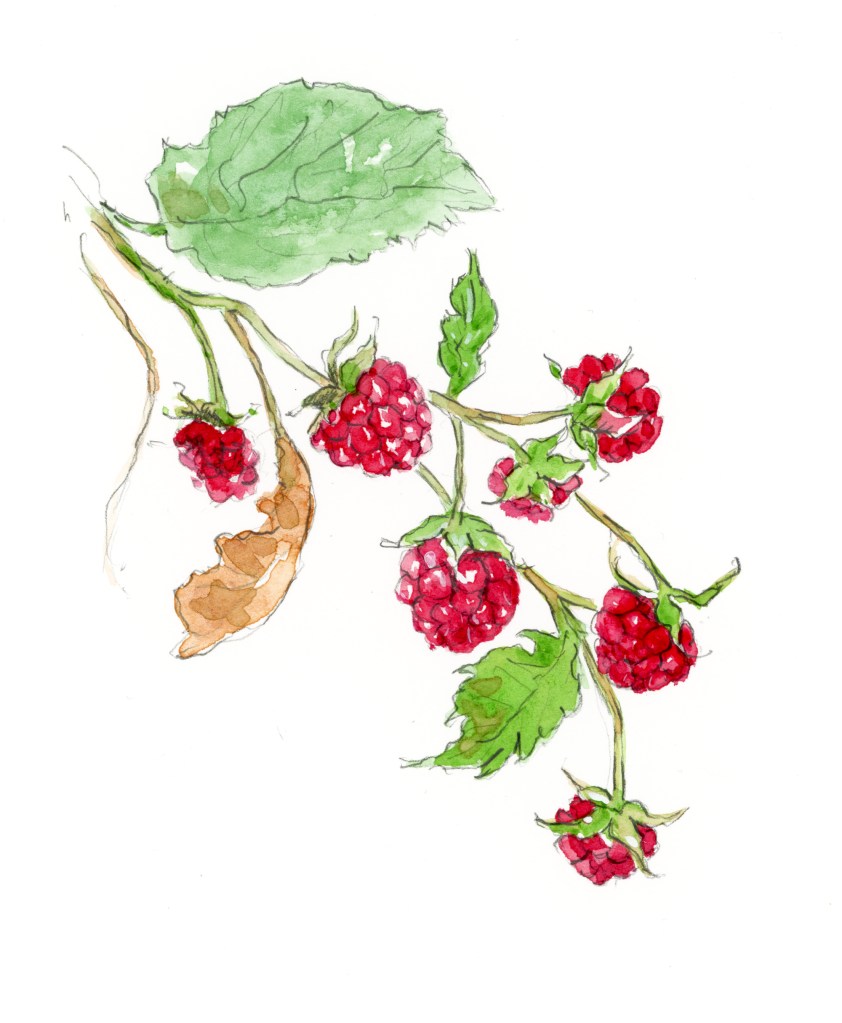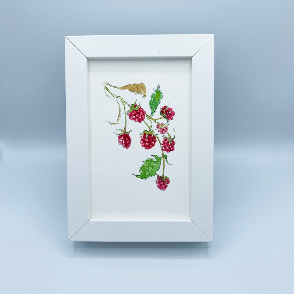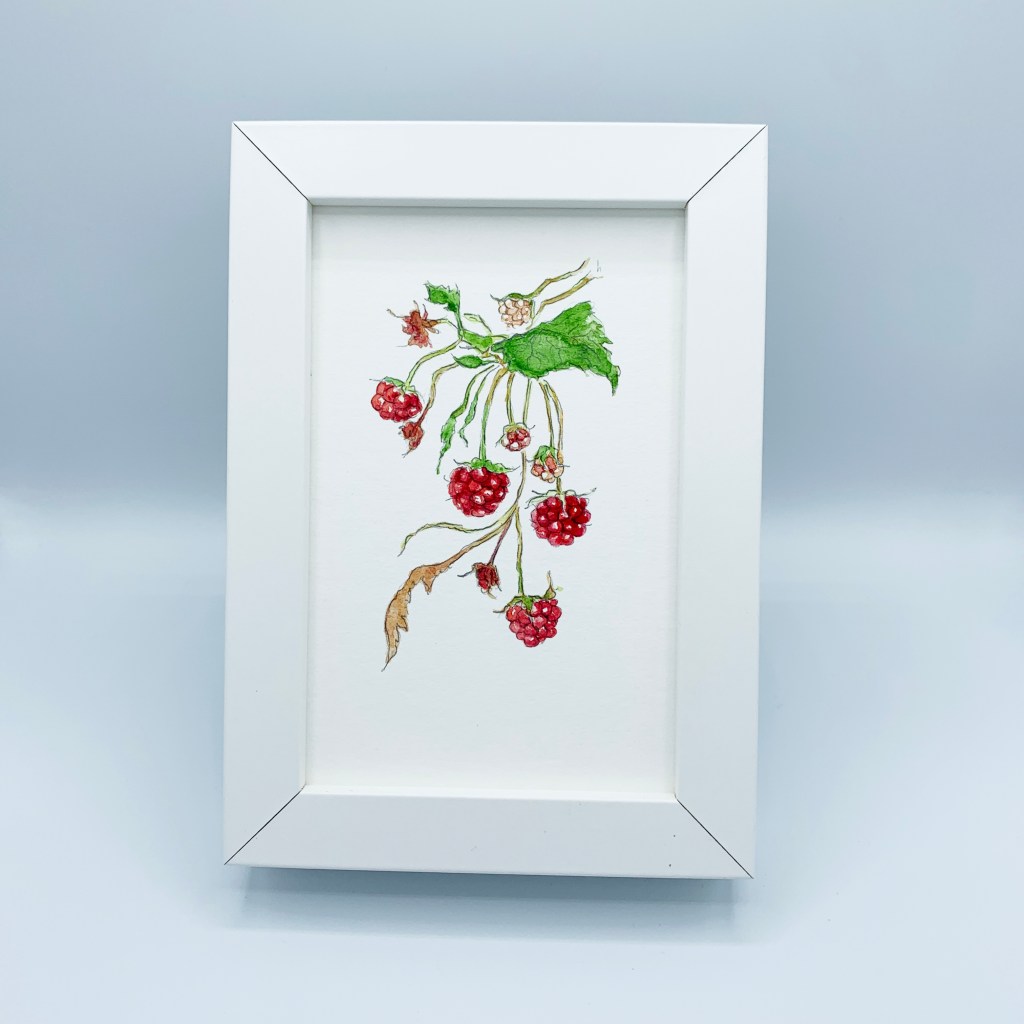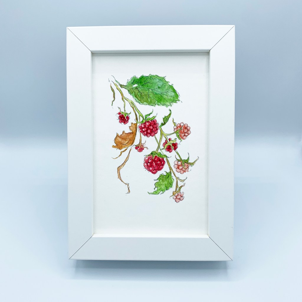 A few weeks ago I visited Andrews Farm in Milton, Ontario… they’ve a gorgeous raspberry patch, and loved the hunt of finding the best raspberries hiding under the shade of the leaves. Later I enjoyed studying the photos I took to create five different illustrated compositions of raspberries on branches. I love how the branches often have dried bits, and enjoyed capturing that too as it just visually adds to the natural feel of foraging for the berries.