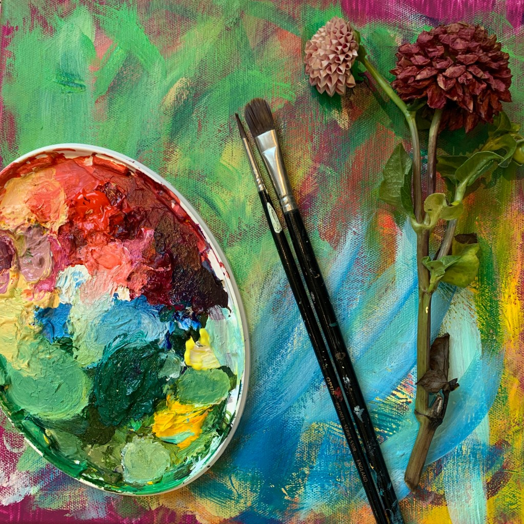 I had a lot of fun painting this bigger piece today & yesterday… I took a lot of photos of the dahlia fields at Andrews Farm a couple weeks back, and have been itching to have a go painting from them as inspiration. Tried to be conscious of not over working the whole thing, leaving some areas loose, while painting details in other areas. Was handy having one last cut dahlia on hand to see how the flowers attach at the back, and how the buds look before opening. At 3×3 feet, it’s one of the bigger paintings I’ve done recently. Again I took a time lapse while painting so you can see it come together… excuse me as I get in the way a bit!