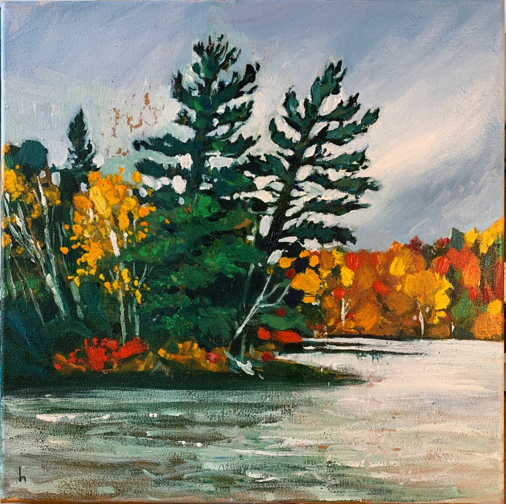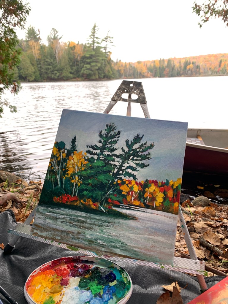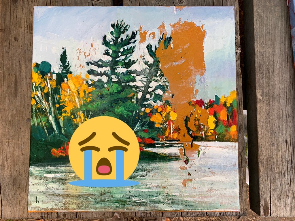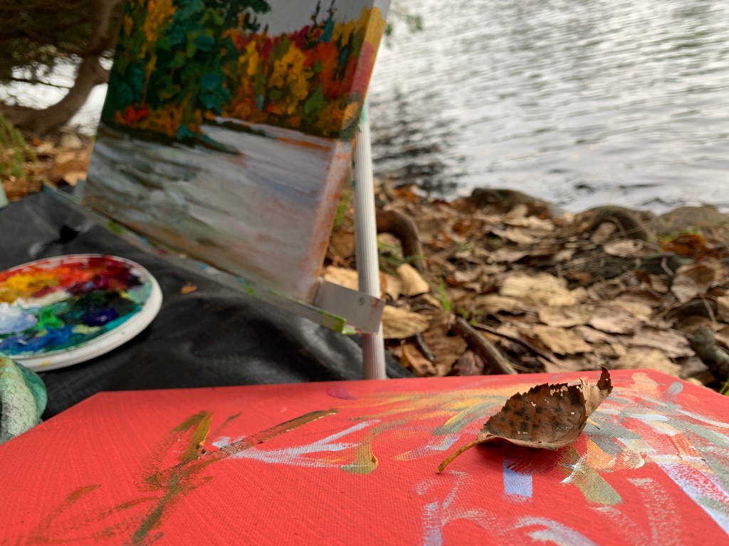 After the early morning painting, I had time to do another from a slightly different view. Felt authentically autumn with leaves falling into my water bucket and on my canvas as I worked. I was very pleased with this little acrylic painting… and then disaster struck!