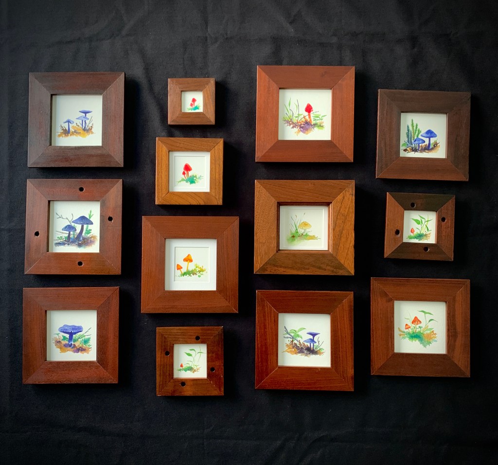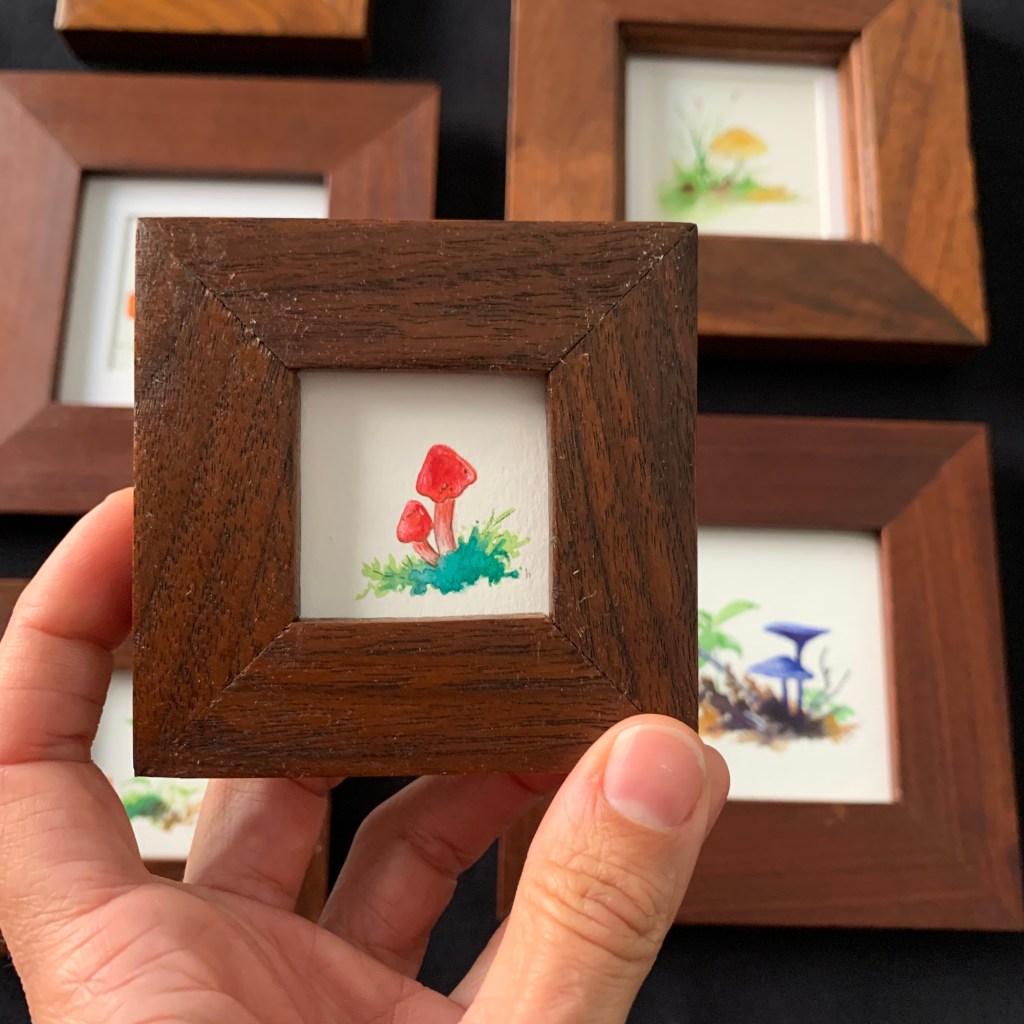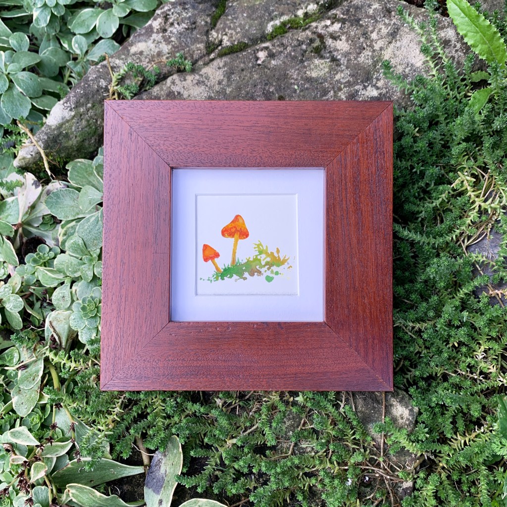 Inspired by the forest floor in Ontario, this limited watercolour collection was painted from photographs I have taken of the varieties of mushrooms that grow through the summer and into autumn in Algonquin Park and the surrounding area. (And one painted en-plein-air… before I accidentally stepped on it!) Framed in reclaimed black walnut wood, the petite size, imperfections, and weight of the wood add to the down-to-earth feel of these pieces.