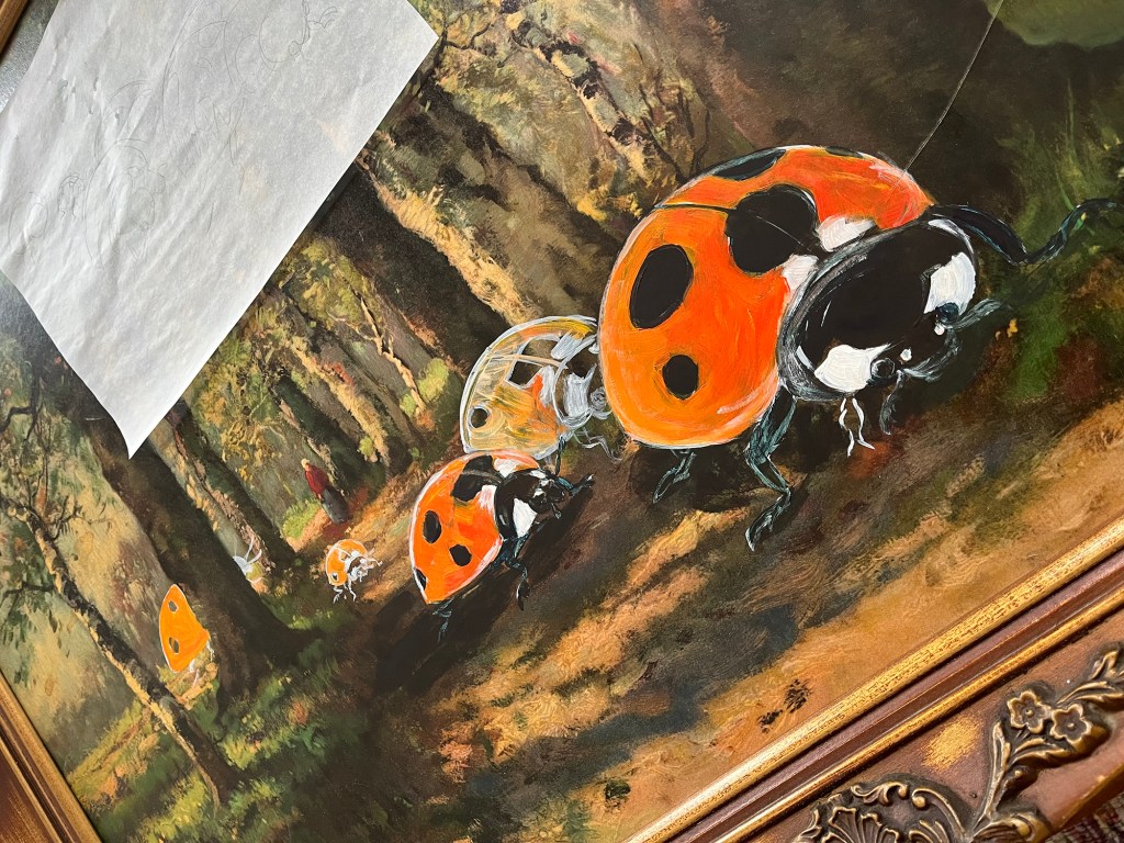 These are works in progress / still drying… hoping to bring them with me to the Festival of Trees market, but at the very least will be putting them up on Etsy. Refreshing these tired-outdated paintings has been such fun, and it makes me happy to bring these masterfully painted pieces back in style with a bit of whimsy! Drop me a line if you would like to reserve one, they are one-of-a-kind and limited to what vintage prints / suitable paintings to work with.
