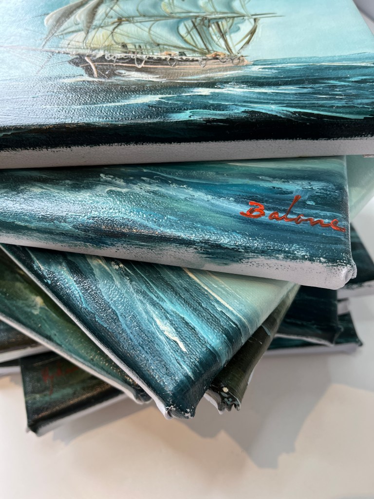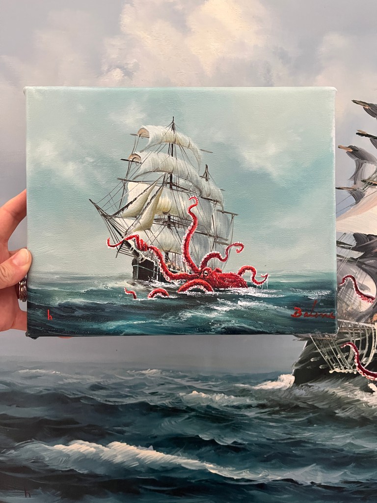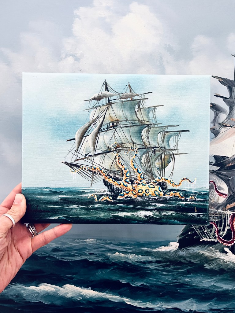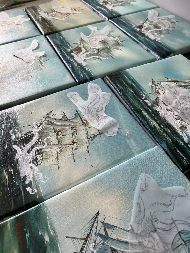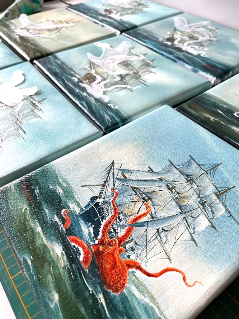 I’ve thoroughly enjoyed working on this collection of Upcycled Vintage Art… Octopus Vs Ship! I came across these nine paintings (nonupulets!) a few months back. This European style of seascape was very popular in the 80’s and 90’s. These are the remnants of a collection of mass produced replica artwork… the paintings were almost identical, just small changes, but clearly a formula followed. Nicely painted, but not antiques. Which made them perfect for upcycling them so they can be appreciated anew by adding in colourful octopus playing with the ships.
