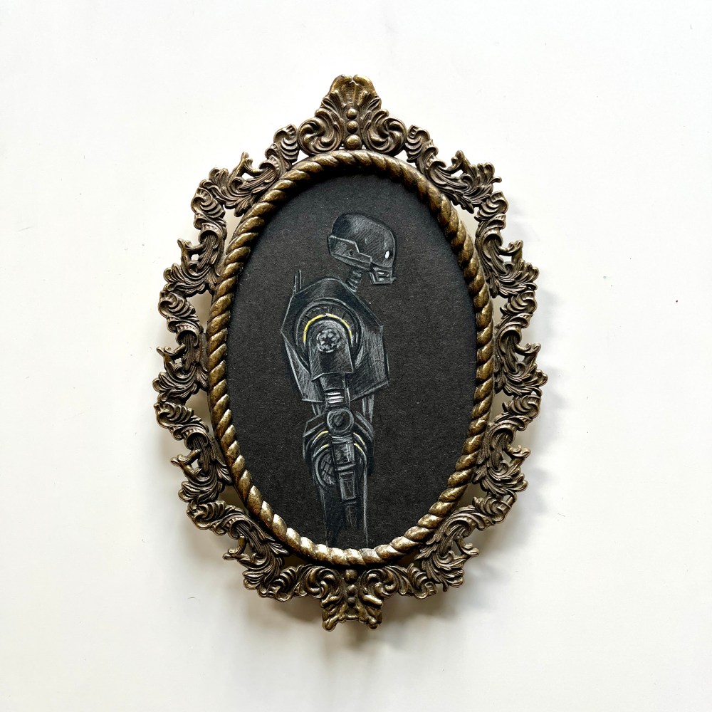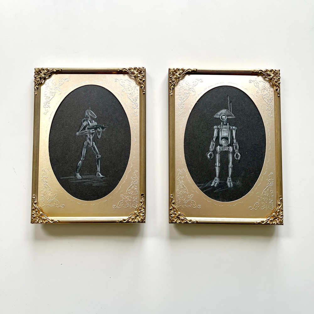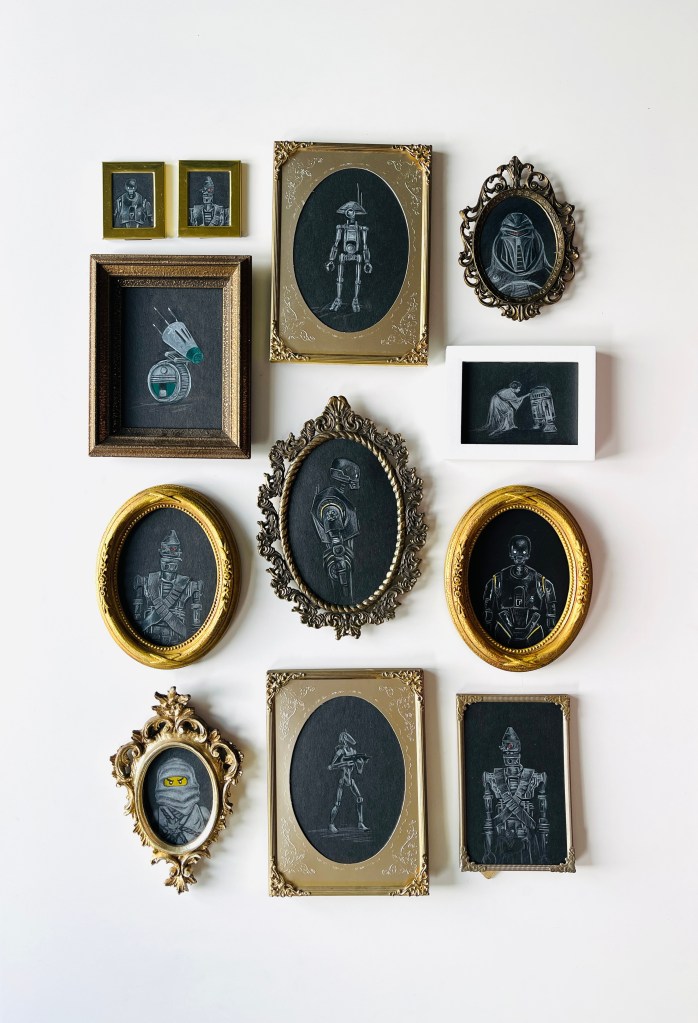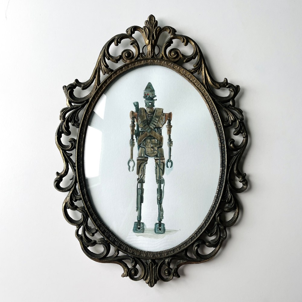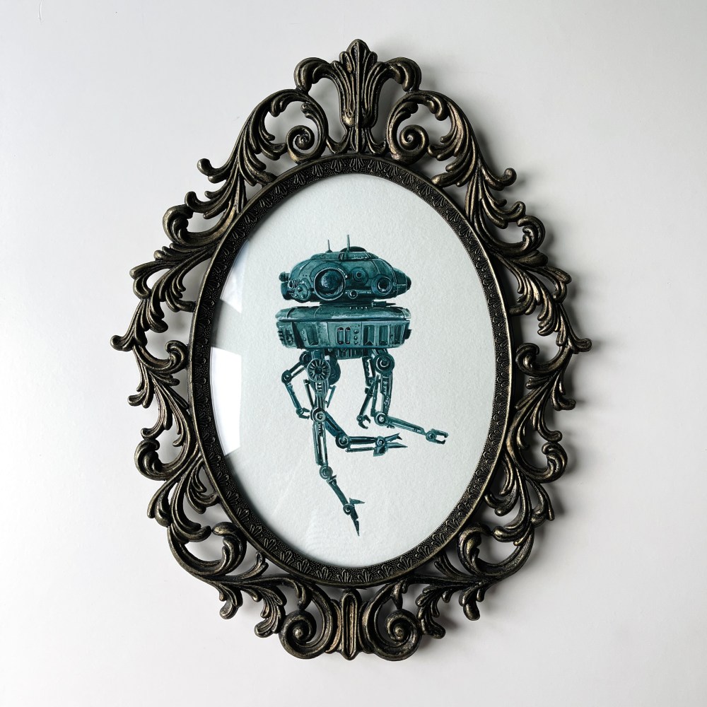 I love the idea of droids sitting for their portraits like our ancestors would in the olden days. It requires a lot of patience to stand perfectly still while one is immortalized in paint… such a contrast to today’s selfie culture. Original paintings, prints and digital downloads on website : Upcycled Vintage Art