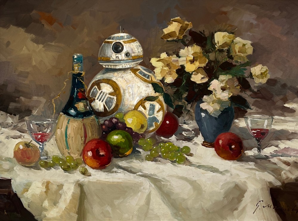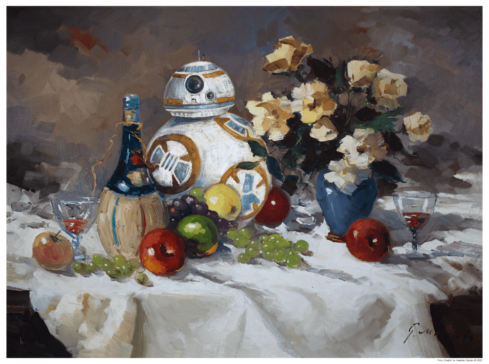 What if Rey sold BB8 for the sixty portions she was offered? Life on Jakku is a struggle… except for the wealthy! I imagined this painting hanging in on the walls of a wealthy scrapper’s ship… boasting to the less fortunate, that not only do they have exotic foods and flowers imported from a neighboring planet, but a state-of-the-art droid to amuse them over brunch.