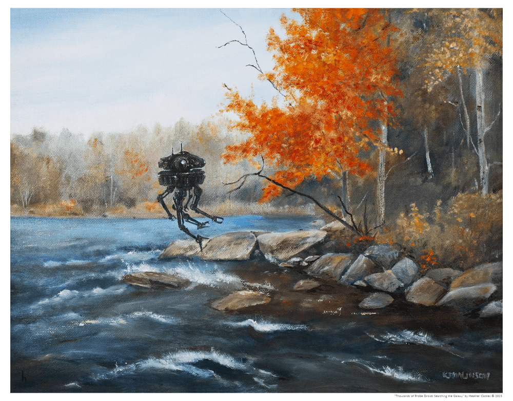When I found this painting, I really liked how the artist had looked at the landscape and was true to what she saw. The branches on the trees aren’t uniform, you can tell she was wanting to capture that particular view in that moment. I enjoyed adding in this probe droid searching this beautiful corner of the galaxy for the rebel scum.